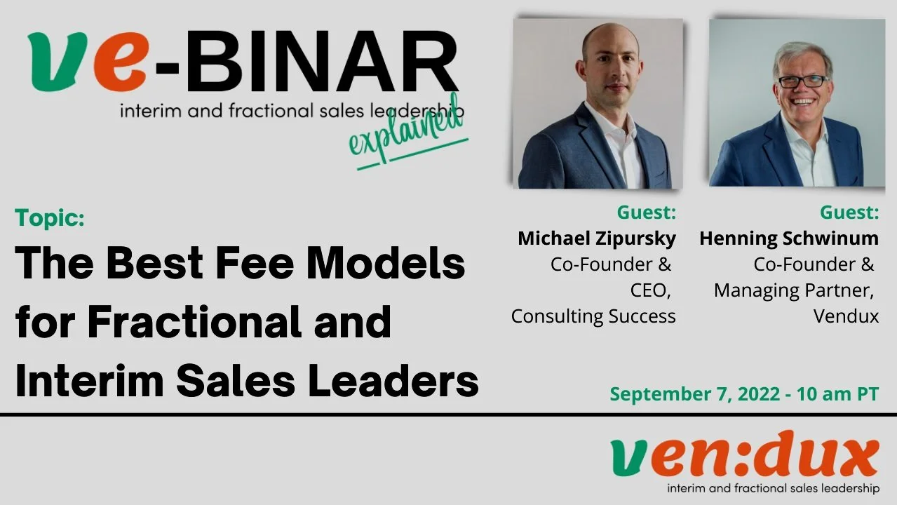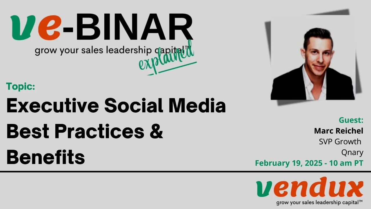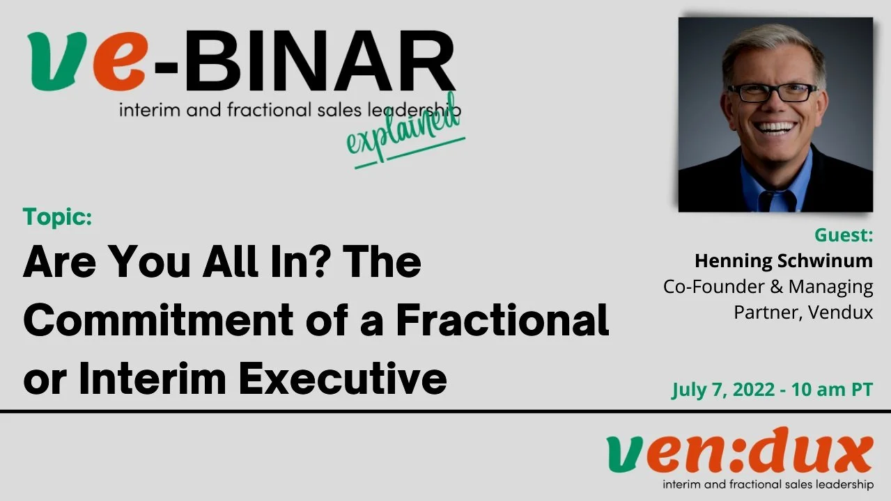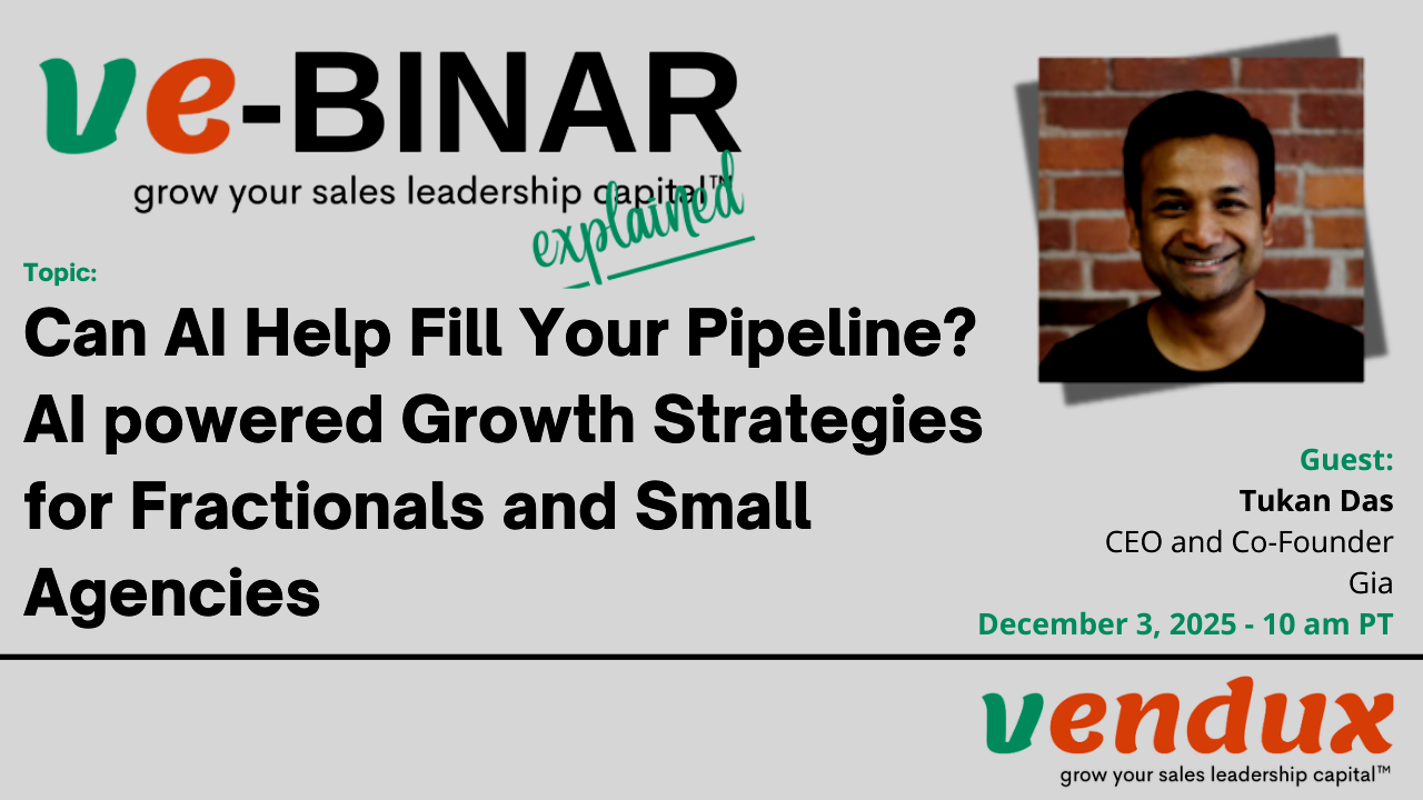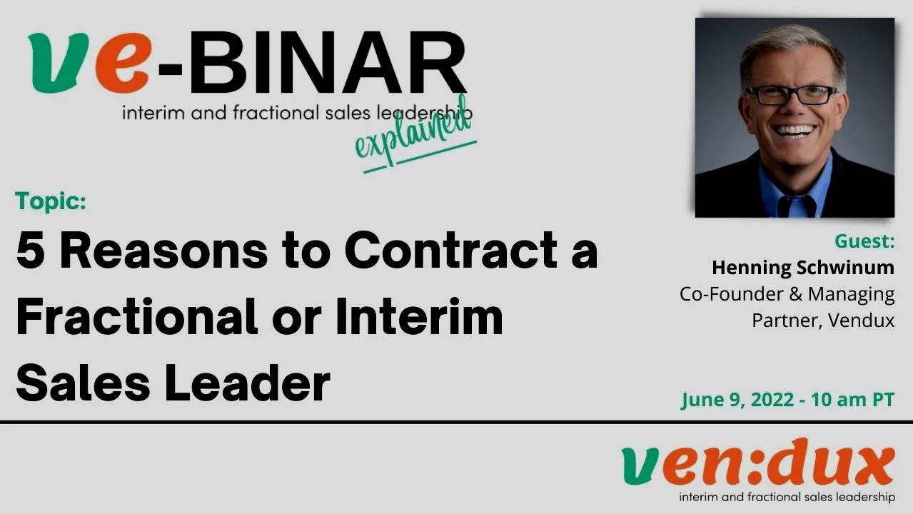 Vendux offers webinars, we call them ve-BINARs, on topics surrounding the fractional and interim executive model and growing sales leadership capital. The content is curated for Executives, Founders, Owners, and CEOs, but also Board members, VC’s, or PE’s, and it addresses questions commonly asked.